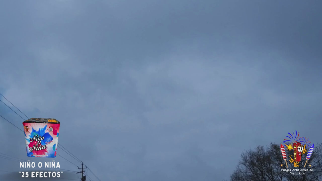 Es una caja de 25 disparos automática, de polvo y luces rosas o azul .